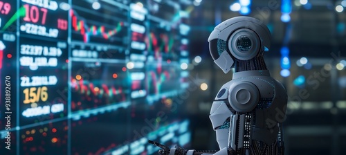 trading robot standing and analyzing the crypto trading graph, symbolizing the graph growth up and artificial intelligence