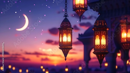 Traditional Arabic Lanterns Hanging with Crescent Moon at Twilight