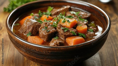 Traditional beef stew in a rustic ceramic bowl, richly garnished with fresh parsley, offers a cozy and inviting appearance perfect for a comforting meal ambiance. Photo with ample copy space.