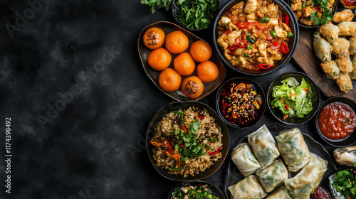 Traditional Chinese festive table with dim sum, dumplings, spicy noodles, oranges and variety of authentic dishes served in black bowls on dark background for lunar new year celebration