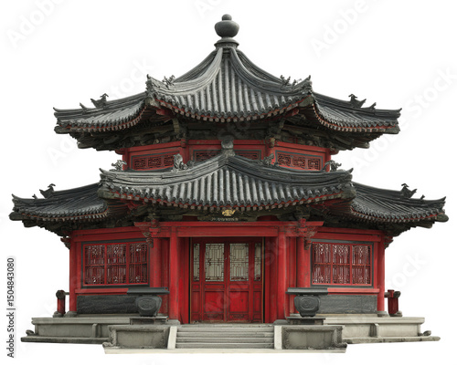 Traditional Chinese pagoda featuring tiered roofs and intricate carvings, showcasing vibrant red and gray colors. This architectural marvel evokes sense of cultural heritage and artistry