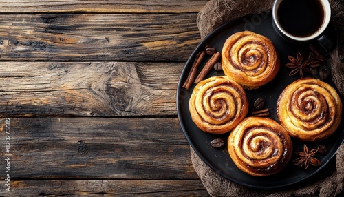 Traditional cinnamon pastries served with coffee on a wooden table, featuring ample space for text.
