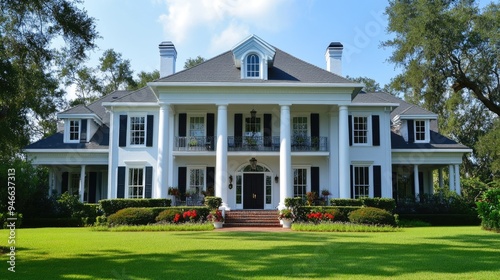 Traditional colonial-style house with symmetrical design, white columns, and a large front lawn, exuding timeless appeal