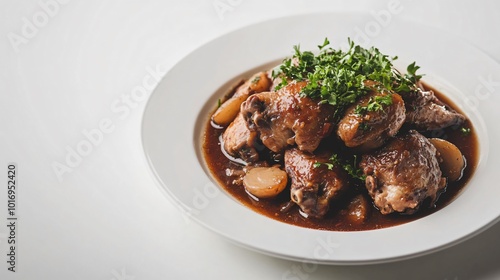 Traditional coq au vin, tender chicken cooked in red wine, placed on a clean, minimalist plate with an isolated background