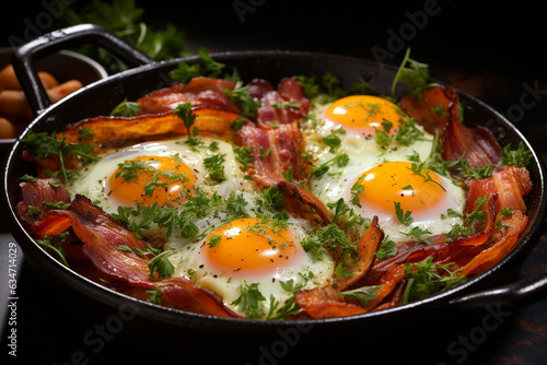 Traditional english breakfast with fried eggs and bacon in cast iron pan on dark background