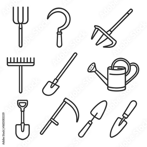 Traditional Farm Tools Icons. Line style icons of traditional farm tools: pitchfork, sickle, hand plow, rake, hoe, watering can,