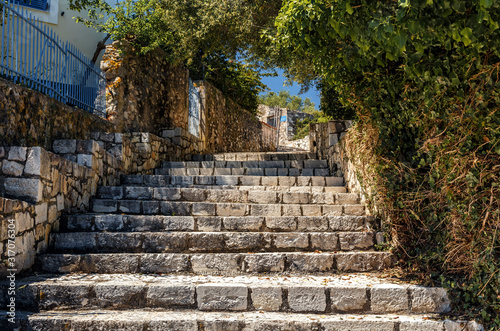 Traditional Greece architecture Traditional old street in Fiscardo village Beautiful Nature cityscape on the Ionian island of Kefalonia, Greece.