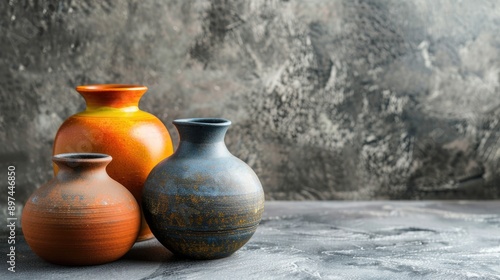 Traditional handmade ceramic on gray backdrop with soft focus and space for text