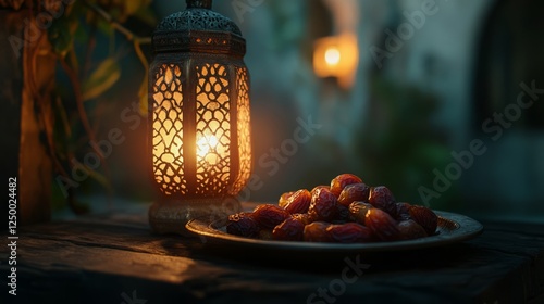 Traditional lantern casting a warm glow on a plate of dates, representing the spiritual essence of ramadan with a serene and festive atmosphere, symbolizing community, reflection, and the blessings of