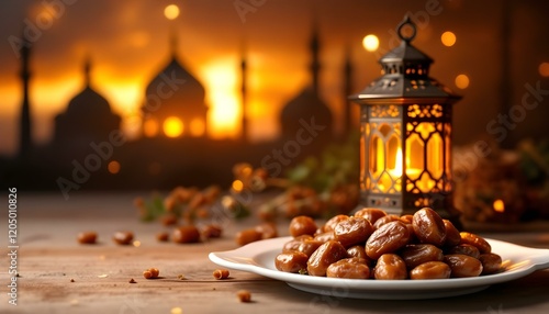 Traditional lantern with glowing light, a white plate of fresh brown dates, mosque silhouette in the background, Ramadan-themed design.