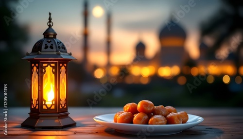 Traditional lantern with glowing light, a white plate of fresh brown dates, mosque silhouette in the background, Ramadan-themed design.