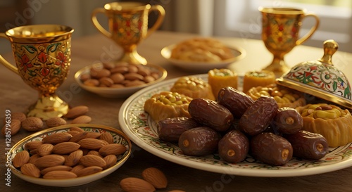 Traditional Middle Eastern Feast with Rice, Stews, and Gold Tableware