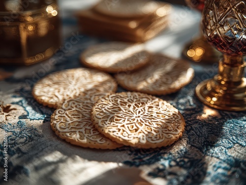 Traditional Middle Eastern style decorative cookies with intricate patterns on a richly textured cloth background with ornate metallic accents