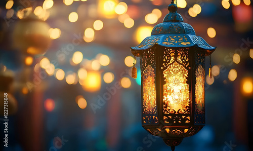 Traditional ornate oriental lantern with beautiful bokeh light background. The first day of the month of Muharram. muslim, tradition, religion.
