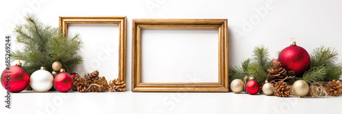 Traditional red and green framing christmas decor on a white background. Greeting card for Christmas and New Year with copy space and mock up