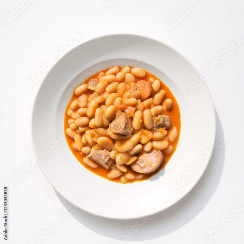 Traditional Spanish fabada asturiana bean stew with chorizo and pork served on a white plate, isolated on white background