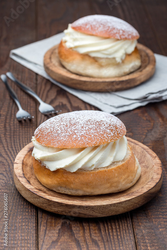 Traditional swedish dessert Semla, also called Shrove bun, with almond paste and whipped cream filling, vertical