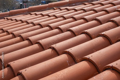 Traditional terracotta red roof tiles. Classic and durable roofing. Old and used overlapping patterns of warm terracotta house red clay tiles used in residential. Material texture, closeup