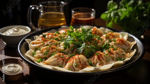 Traditional Turkish Manti in a bowl, close-up. Created with generative AI.