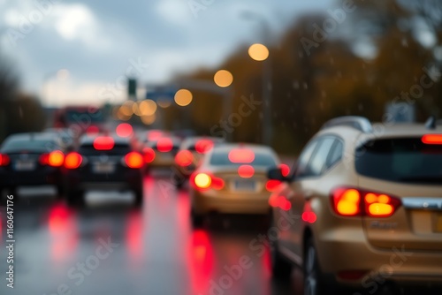 Traffic jam heavy traffic on a rainy evening with blurred red lights bokeh and copy space