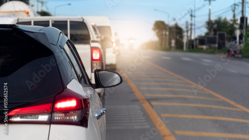Traffic jam with several vehicles lined up on a road. Close up car with its tail lights of white car. Cars are parked in a long line on the hill. There are yellow lines on the road.