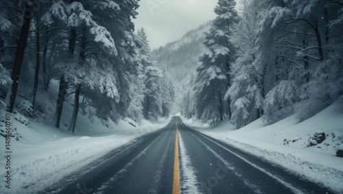 Traffic-free road in winter with snow-covered mountains as the backdrop