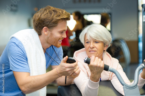 trainer encouraging senior woman exercising