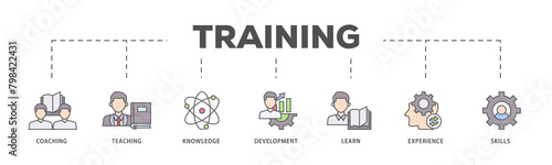 Training and development icons process flow web banner illustration of trainer, professional development, supervisory, trainee, instructor, coaching icon live stroke and easy to edit