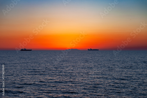 tramonto scuro serale costa mediterranea con due navi all'orizzonte