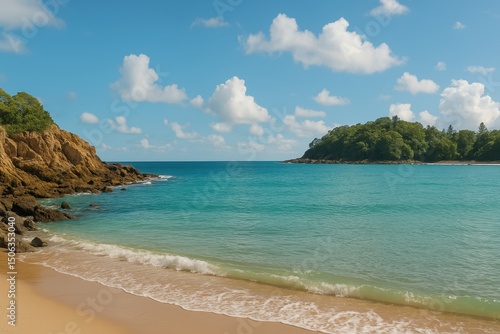 Tranquil Beach Scene with Calm Waters and Lush Green Island Under a Bright Blue Sky with Fluffy White Clouds