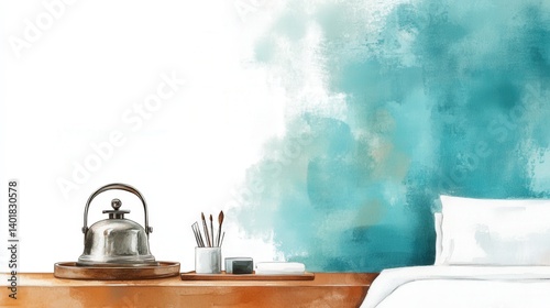 Tranquil bedroom scene with a bedside table, teal wall art, and serene ambiance for relaxation