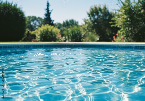 Tranquil blue swimming pool with shimmering water and lush greenery.