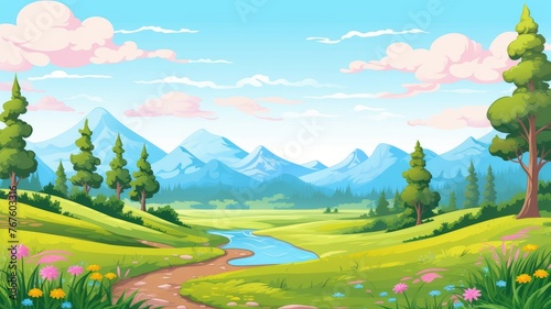 Tranquil cartoon valley with a river flowing through lush greenery and distant mountains