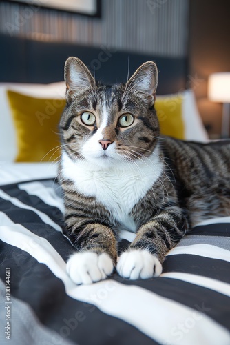 Tranquil cat in a bedroom illuminated by soft hues, capturing graceful stillness
