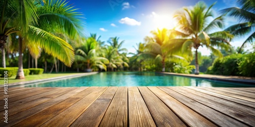 Tranquil Escape Close-Up of a Warm Honeyed Wooden Deck Leading to a Shimmering Turquoise Pool Framed by Lush Tropical Paradise Under Bright Blue Sky and Fluffy Clouds