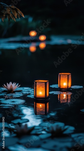 Tranquil Evening Scene with Lanterns Floating on Water Lily Pond