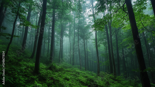 Tranquil Forest Landscape with Soft Mist