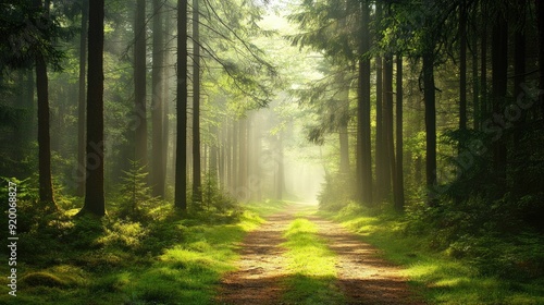 Tranquil forest landscape with tall trees, a misty path, and dappled sunlight, ideal for nature walk themes