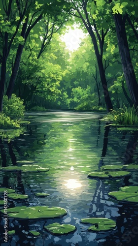 Tranquil Forest Scene with Sunlight Reflecting on a Serene River Surrounded by Lush Greenery and Vibrant Lily Pads Creating a Peaceful Atmosphere