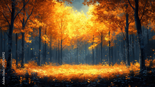 tranquil forest scene with vibrant orange foliage and soft lighting, creating serene atmosphere. golden leaves contrast beautifully with dark trees, inviting peace and reflection