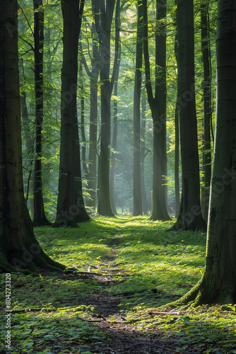 Tranquil Forest Scenery with Sunlight Through Ancient Trees