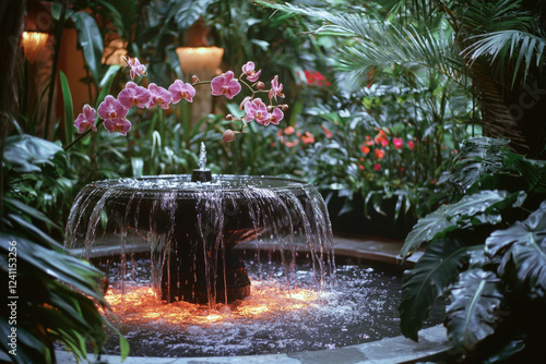 Tranquil garden fountain adorned with vibrant orchids in a lush retreat