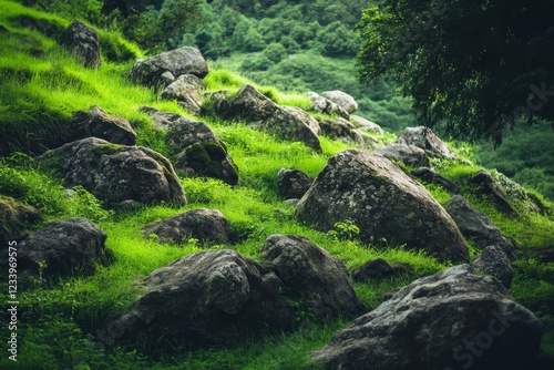Tranquil Green Landscape with Mossy Rocks in Lush Forest Setting