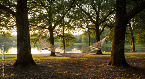 Tranquil Hammock Strung Between Tall Trees Near Serene Lake at Sunset