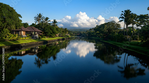 Tranquil Lake Reflection Of Trees And Clouds Under Blue Sky