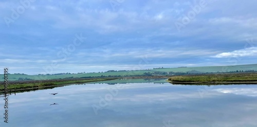 Tranquil lake reflection with hills and sky.