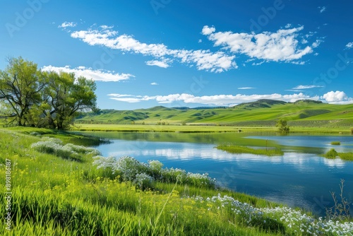 Tranquil Lake Surrounded by Rolling Green Hills and Lush Grass