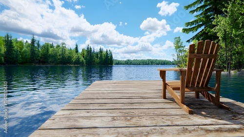Tranquil Lakeside Scene with Wooden Chair on Dock Under Blue Sky