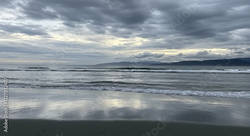 Tranquil ocean waves gently lap the shore at dawn reflecting a moody sky A serene coastal landscape perfect for travel tourism and relaxation themes