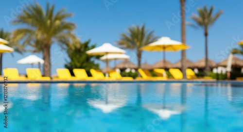 Tranquil poolside scene with yellow loungers and palm trees under a clear sky